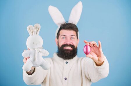The great spring festival of Easter. Bearded man with bunny toy and Easter egg. Celebration of spring time. Hipster with long rabbit ears holding egg laying hare. Easter bunny delivering colored eggs