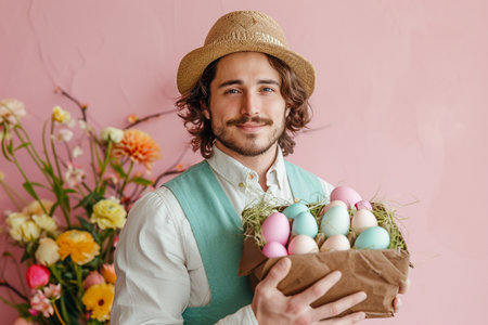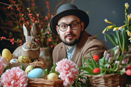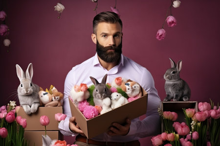 happy bearded man holds a colorful box with easter flowers and bunny, eclectic style