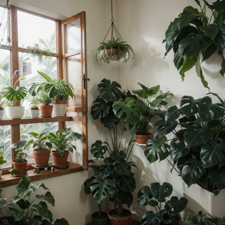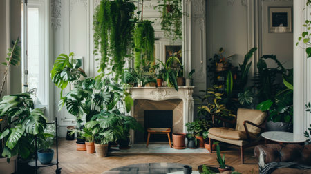 Elegantly Decorated Living Room Filled with Lush Green Houseplants and Modern Furniture
