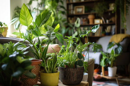 A cozy living room filled with various houseplants in terracotta pots, set against a dark green wall, creating a lush and inviting ambiance with a mix of different green hues and plant textures. AI generated image
