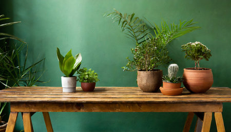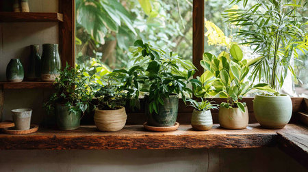A variety of green indoor plants displayed in rustic pottery on a wooden table, creating a natural and cozy ambiance.