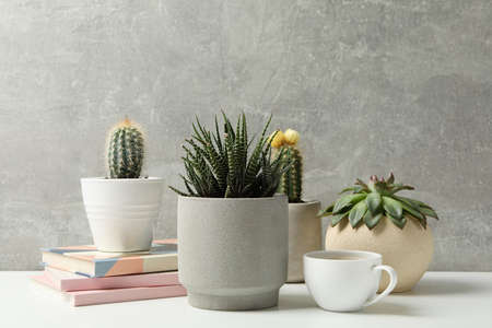 Succulent plants, coffee and notebooks against grey background. Houseplants