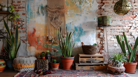 A snug bohemian corner showcases a delicately handwoven macrame table runner, repurposed reclaimed wooden fruit crates, and air-purifying snake plants, complemented by a modern sculptural metallic