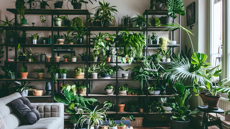 A vibrant and inviting home environment featuring shelves of indoor plants and decor, highlighting the importance of nature in our everyday lives.generative ai