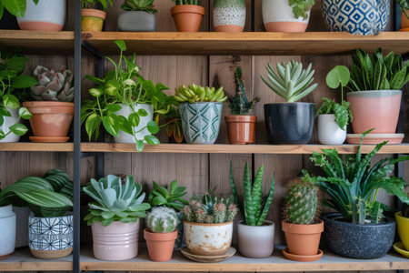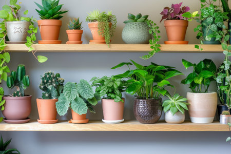 Variety of indoor plants in decorative pots arranged on shelves. Ideal for home gardening and interior design themes.