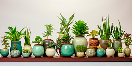 Indoor plants in various ceramic pots mounted on shelves, against pale gray wall create lush green vegetation display, transforming an ordinary room into cozy home greenhouse. Copy space.