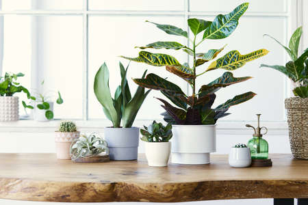 Collection of various tropical green plants in different pots. Home gardening, greenery composition, flowerpots in interior design, hobby concept. Modern living room indoor with scandinavian interior
