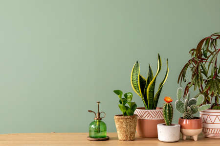 Stylish composition of home garden interior filled a lot of beautiful plants cacti succulents air plant in different design pot