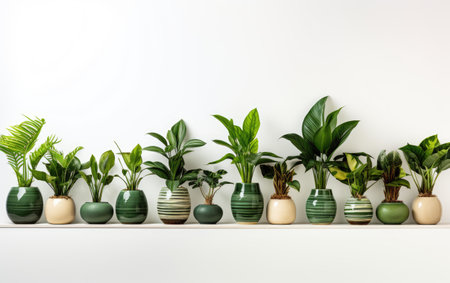 Collection of various houseplants in ceramic pots Exotic house plants displayed on white shelf against white wall Transparent background for easy use in design projects