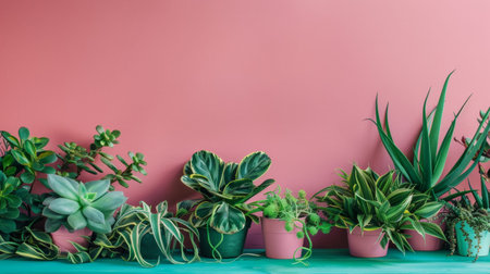 An assortment of various potted plants arranged against a pink background, creating a vibrant and fresh indoor gardening scene.