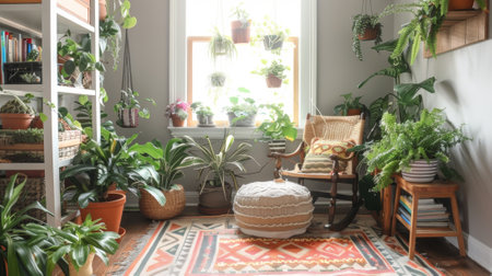 Tucked away in a booklined alcove a mini greenhouse houses a charming array of ferns peperomias and spider plants while a cozy rocking chair and woven pouf provide a nook for relaxation
