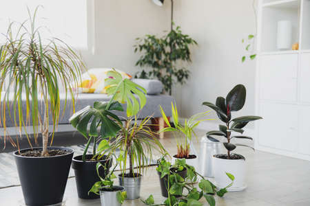 Stylish interior of with many different houseplants Interior with plants in living room on the floor. Composition of home garden plants industrial green interior. Urban jungle interior with houseplants.