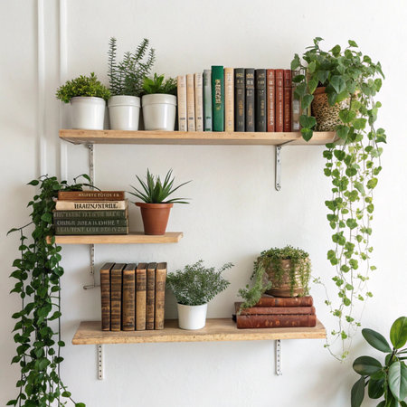 Modern Living Room Decor With Lush Indoor Plants on Wooden Shelving During Daytime.