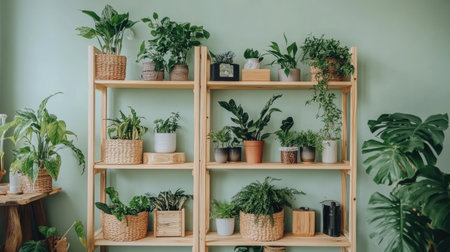 This image showcases a beautiful arrangement of indoor plants on stylish wooden shelves, set against a soft green wall. Perfect for home decor ideas.