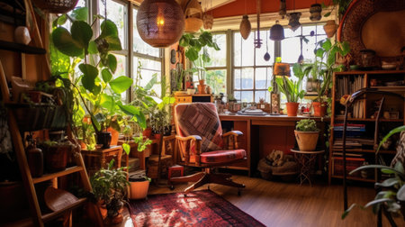 Inspiring office interior design Bohemian style Creative space featuring Eclectic decor architecture. Generative AI AIG 31.