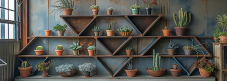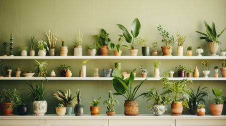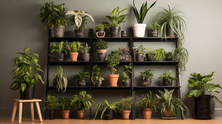 Shelf filled with potted plants. Home decor and tree lover concept. Generative AI illustration