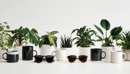 A collection of potted plants and drinkware is arranged with sunglasses.