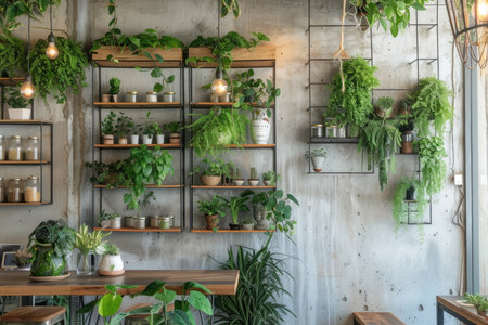 Lush green plants on wooden shelves against a concrete wall in a cozy cafe interior. Indoor garden concept for eco-friendly design and decoration