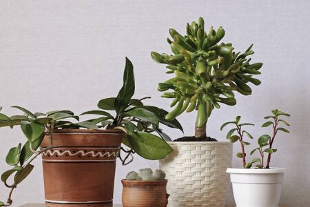 Pots with home plants stand on a cabinet against a wooden wall. Horizontal photo
