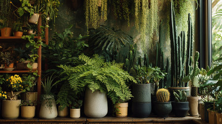 The lively indoor plant shop features an array of greenery displayed on shelves and tables, creating a calming atmosphere under bright, natural light.