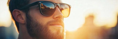 A man stands still, basking in the warm glow of the sunset, wearing sunglasses and taking in the cityscape around him.