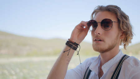 A man in white shirt walking outdoors. Action. Young man with blue eyes and curly blond hair putting on sunglasses on green field, hills, and blue sky background.