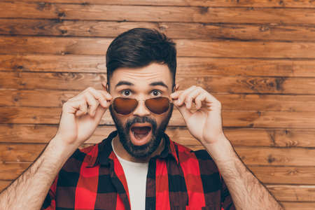confident and handsome guy spring portrait. brutal bearded man wear casual shirt and sunglasses. male summer fashion and beauty. brutal caucasian hipster with moustache outdoor