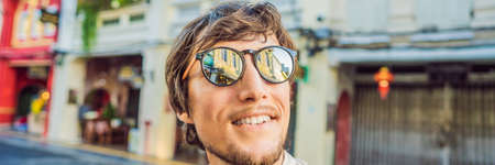 Man tourist on the Street in the Portugese style Romani in Phuket Town. Also called Chinatown or the old town BANNER, LONG FORMAT