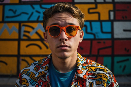 Young man wearing reflective sunglasses and a hoodie standing against an urban graffiti wall