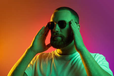 One handsome bearded young man in sunglasses isolated over gradient orange pink background in neon lights. Hands to face