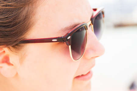 Oversized sunglasses model with big black lenses shoot outside in nature in a summer day closeup . Selective focus