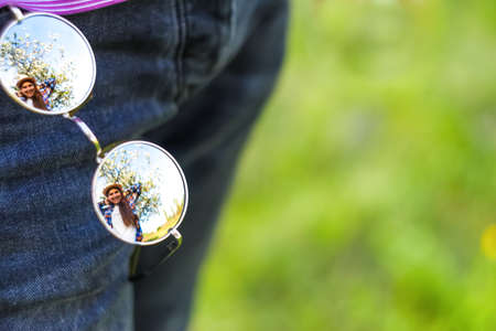 Sunglasses with round lens shoot outdoors in a sunny day closeup. Selective Focus