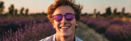 A young man enjoys a moment in a lavender field, smiling brightly while wearing purple sunglasses. The sun sets in the background, creating a warm glow over the colorful flowers.