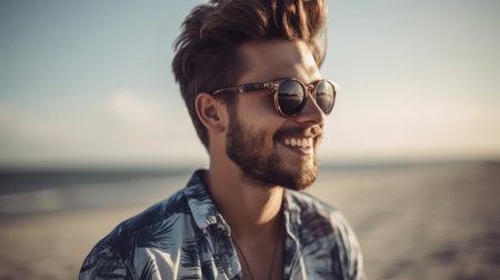 Portrait of handsome young man in sunglasses on the beach at sunset