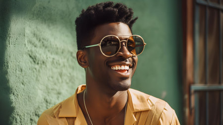 An AI-generated illustration of a portrait of an African young man wearing sunglasses and smiling.
