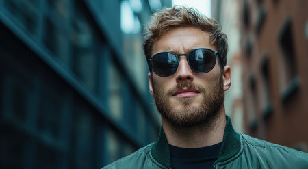 young man in stylish sunglasses and bomber jacket posing near gray wall