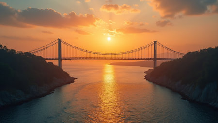 A dramatic suspension bridge stretches across a misty body of water as the sun rises, painting the sky with vibrant colors.