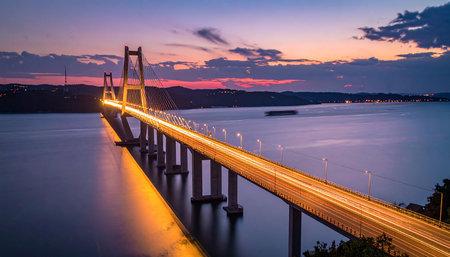 Nighttime view of a bridge with bright light trails captured using long exposure, reflecting on the calm river surface