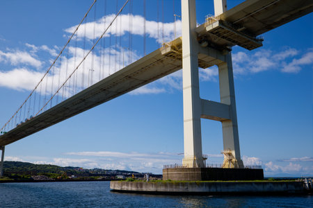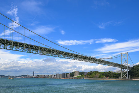 View of Kanmon Bridge and Kanmon Straits in the blue sky Fukuoka Japan