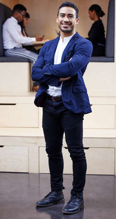 Standing tall and proud in my position as CEO. Full length shot of a handsome young businessman standing in the office with his arms folded.