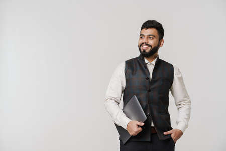 Bearded south asian man wearing vest laughing while posing with laptop isolated over white wall