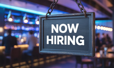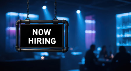 A NOW HIRING sign hangs prominently in a dimly lit bar or club, indicating job opportunities in the hospitality industry. The background features blurred figures and blue ambient lighting.