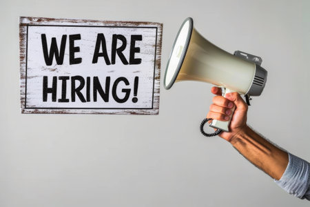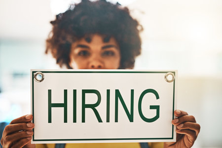 Human resources employee displaying signs for recruiting as part of advertising campaign to attract professional candidates to available positions within the growing business. Talent retention.