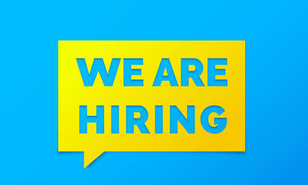 We are hiring job employee vacancy announcement message chat banner on yellow speech bubble with blue background.