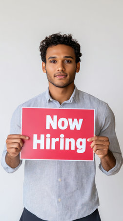 A man holding a Now Hiring sign, advertising job openings and employment opportunities.