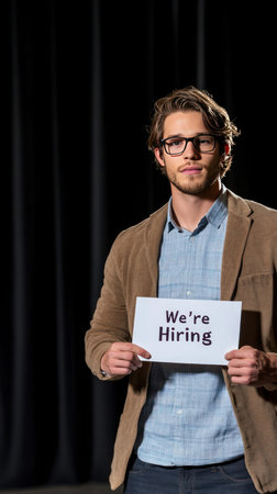 A man with glasses holds a sign that says Were Hiring.