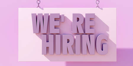 We Are Hiring label. Business vacancy text message, Staff wanted concept. Pastel pink color hanging sign. 3d render