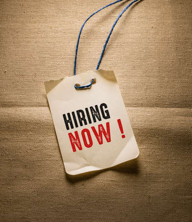 Now hiring text on yellow note with blue sheet on wooden desk. Consept