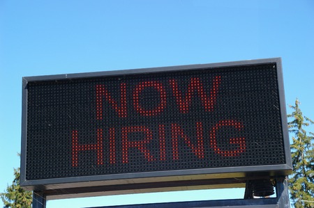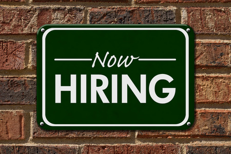 Now Hiring Sign, A green sign with the word Now Hiring with an arrow on a brick wall