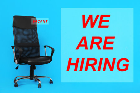 Empty office chair with word Vacant on light blue background. Recruitment concept